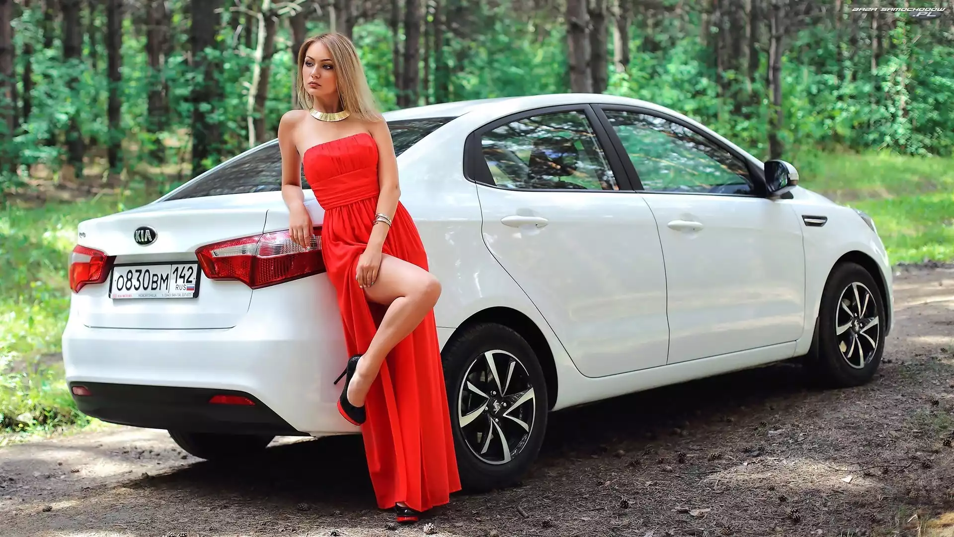 Droga, Las, Biała, Kobieta, Kia Rio- Zdjęcia samochodów